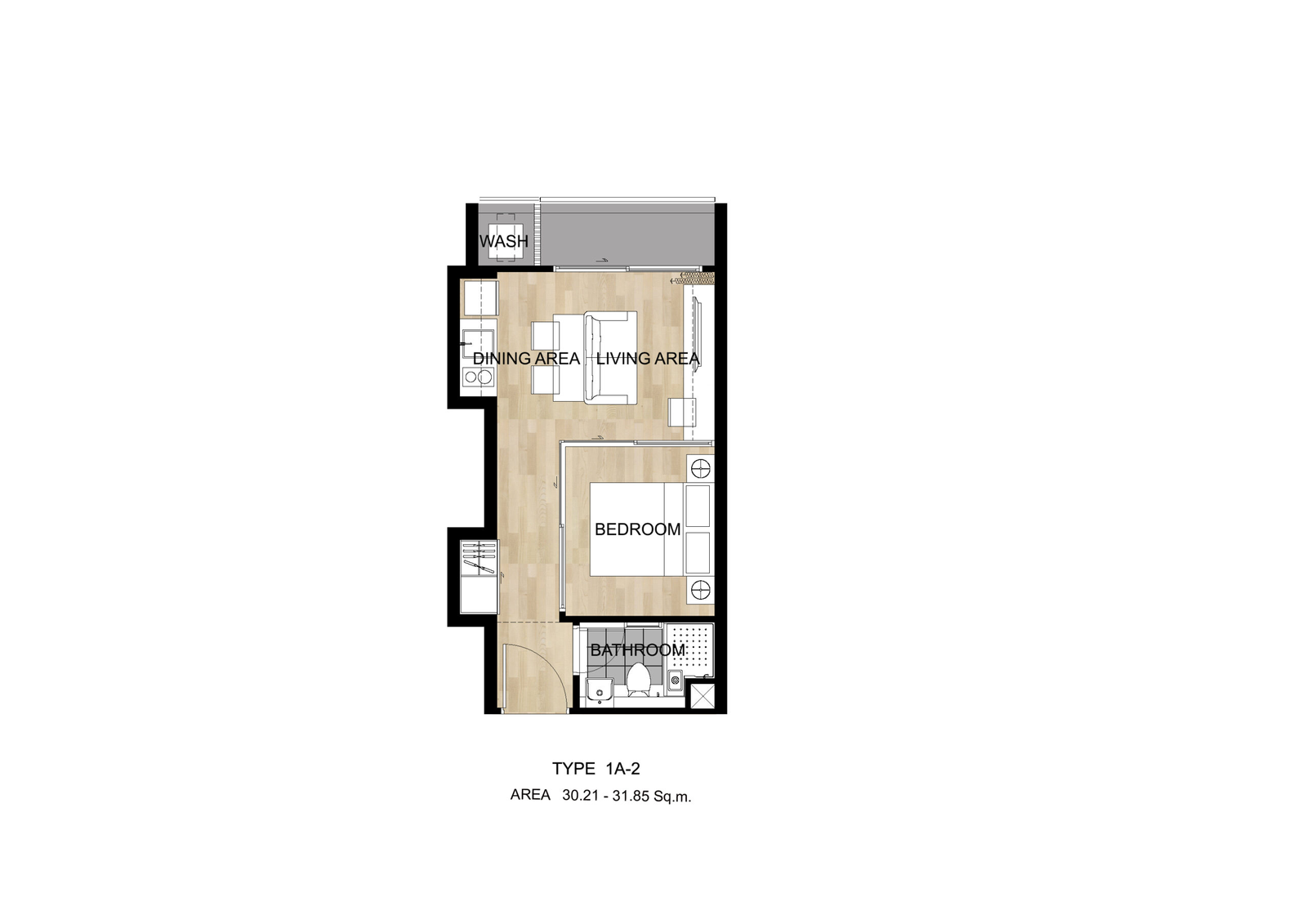 - 1 bedroom: 29.70 - 31.85 SQ.M.