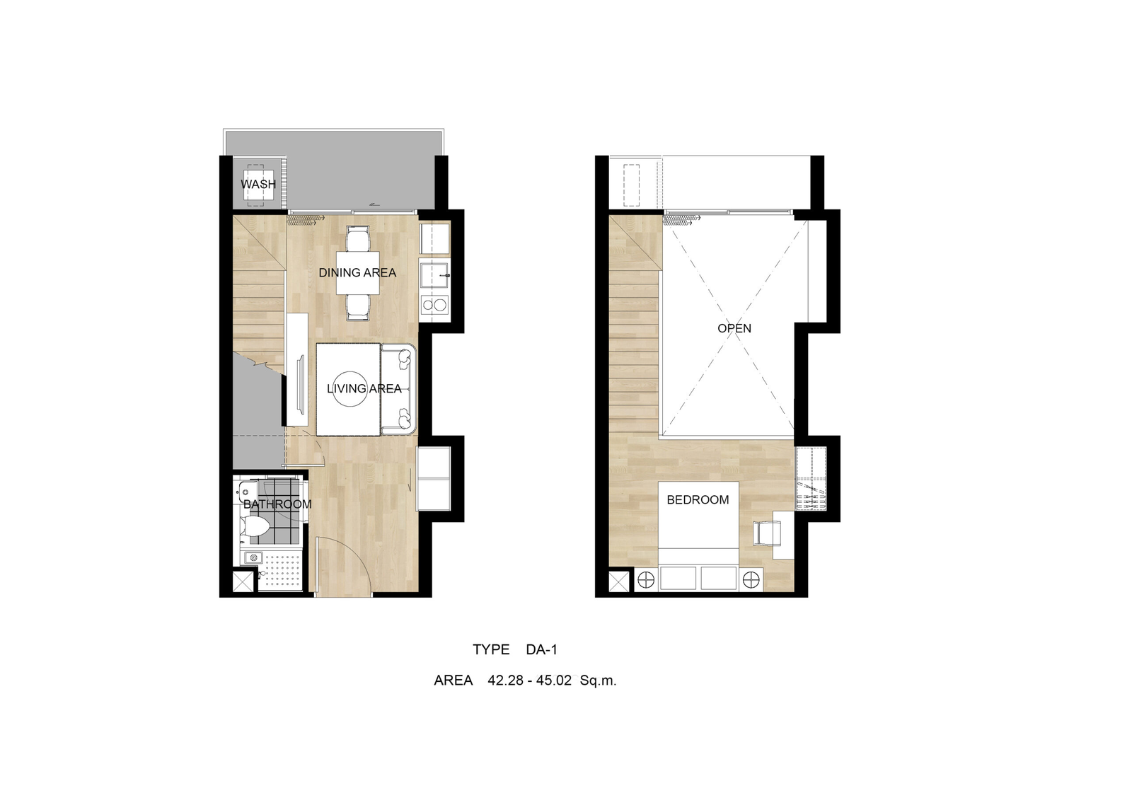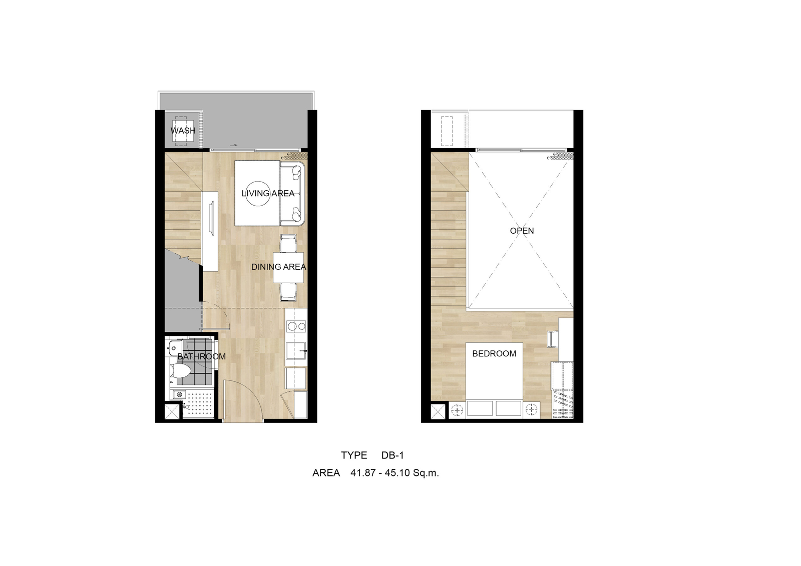- 1 bedroom Duplex:  41.39 - 48.75 SQ.M.